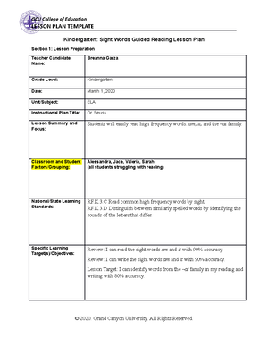 Breanna Garza Spd 200 Rs Kindergarten Sight Words Guided Reading Lesson Plan Studocu